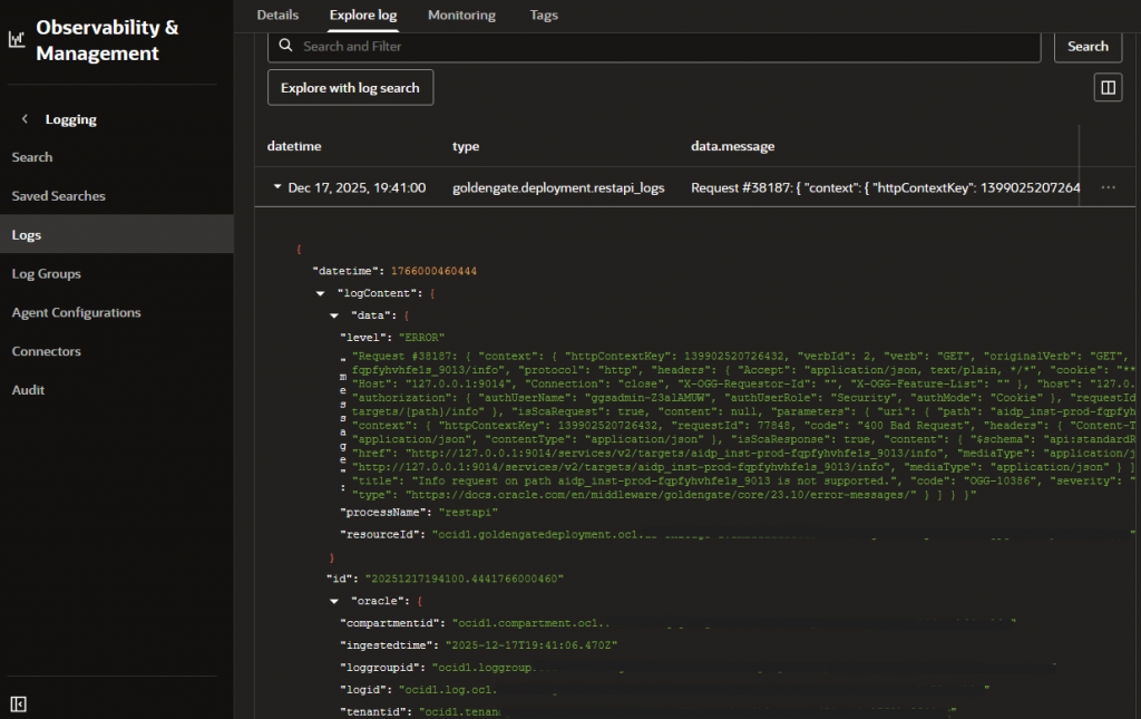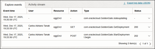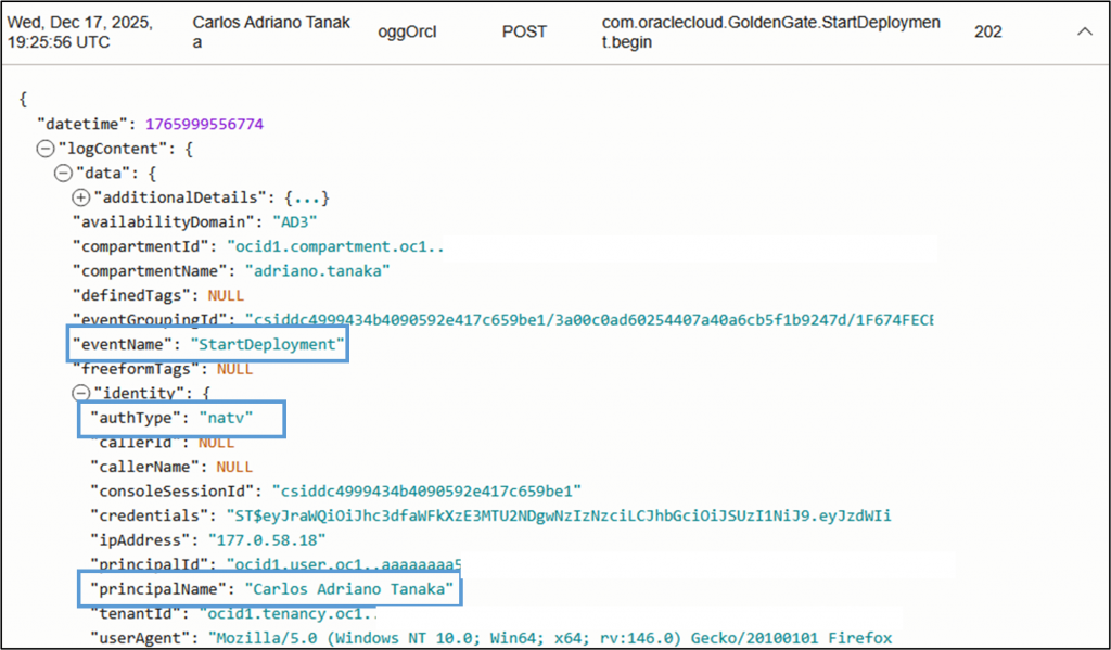 We can leverage OCI Auditing to retrieve audit trails to answer some questions like: Who started/stopped/deleted my deployment? Who removed the connection… and using the OCI Auditing (Observability & Management  > Logging > Audit) we can easily find the answers: