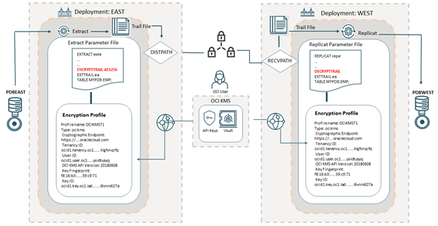By default, GoldenGate will use a local wallet to encrypt your trail, but you can leverage it to OCI Vault to achieve better security, in case of a malicious user get access to your trail files he will need to have access to the wallet from the Vault since that wallet couldn’t be exported from it.