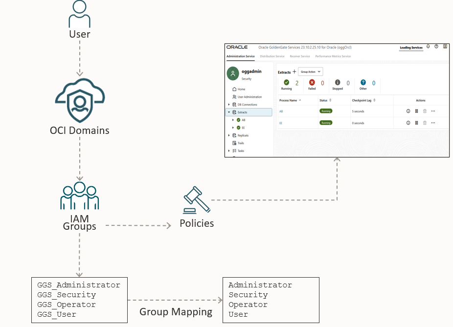 To start, we can discuss about the roles in a GoldenGate environment, we usually have a scenario where one person (or group) manages the service (in OCI) and process (extract, replicat, etc) inside GoldenGate deployment, but here we are talking about security so we could split it into three groups:
